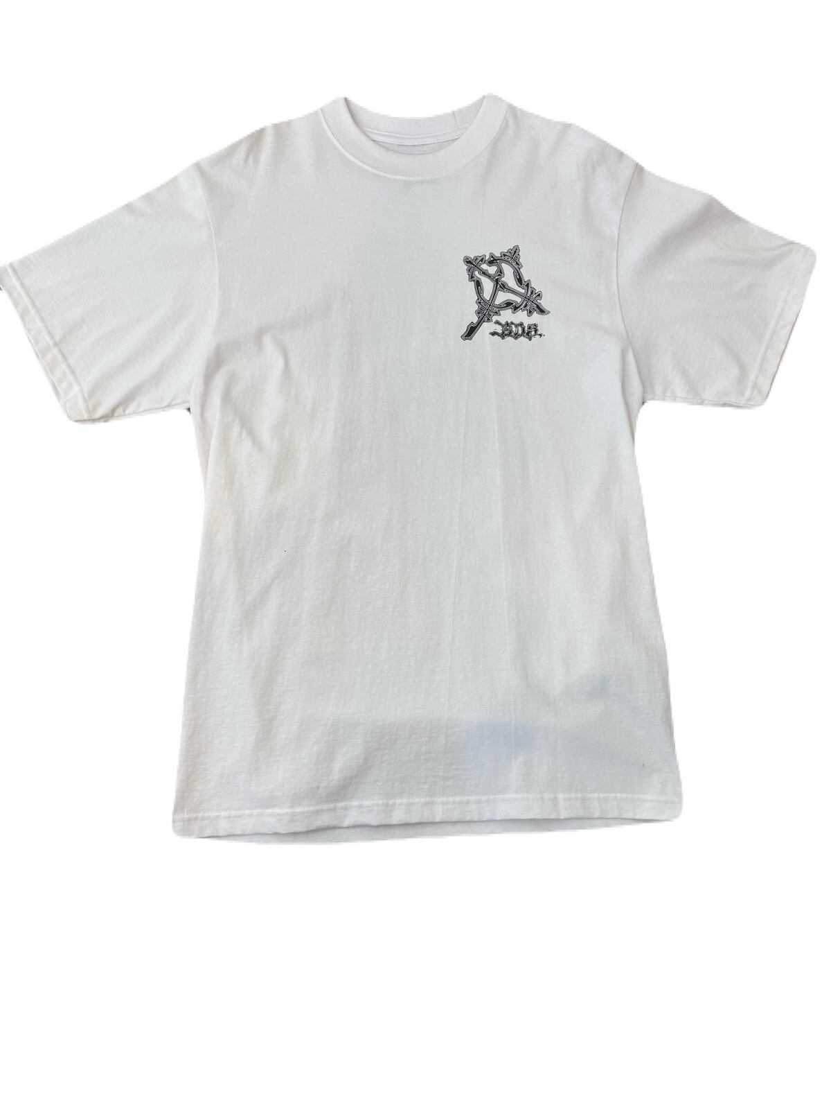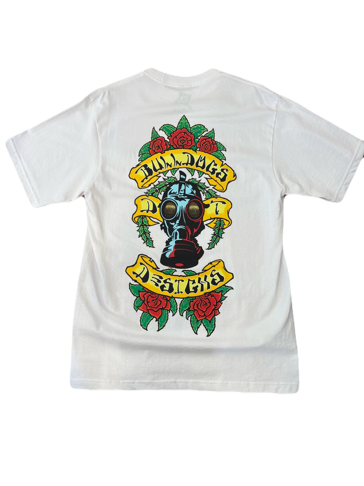 背面にガスマスク×ローズのグラフィックが入ったデザインTシャツ。