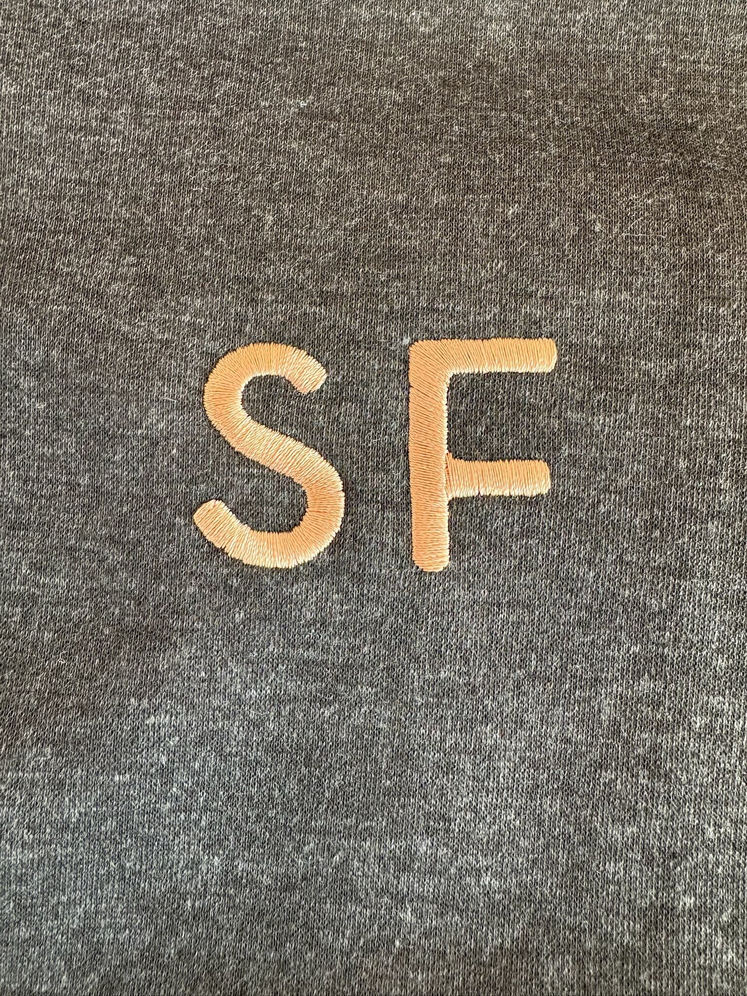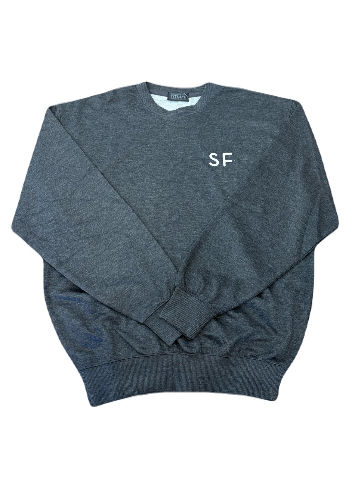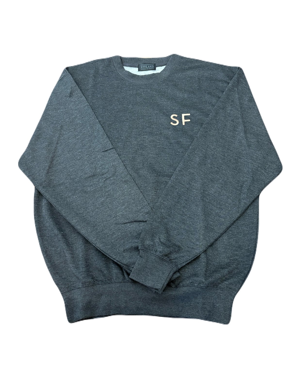 胸元に「SF」ロゴを刺繍したシンプルなクルーネックスウェット。